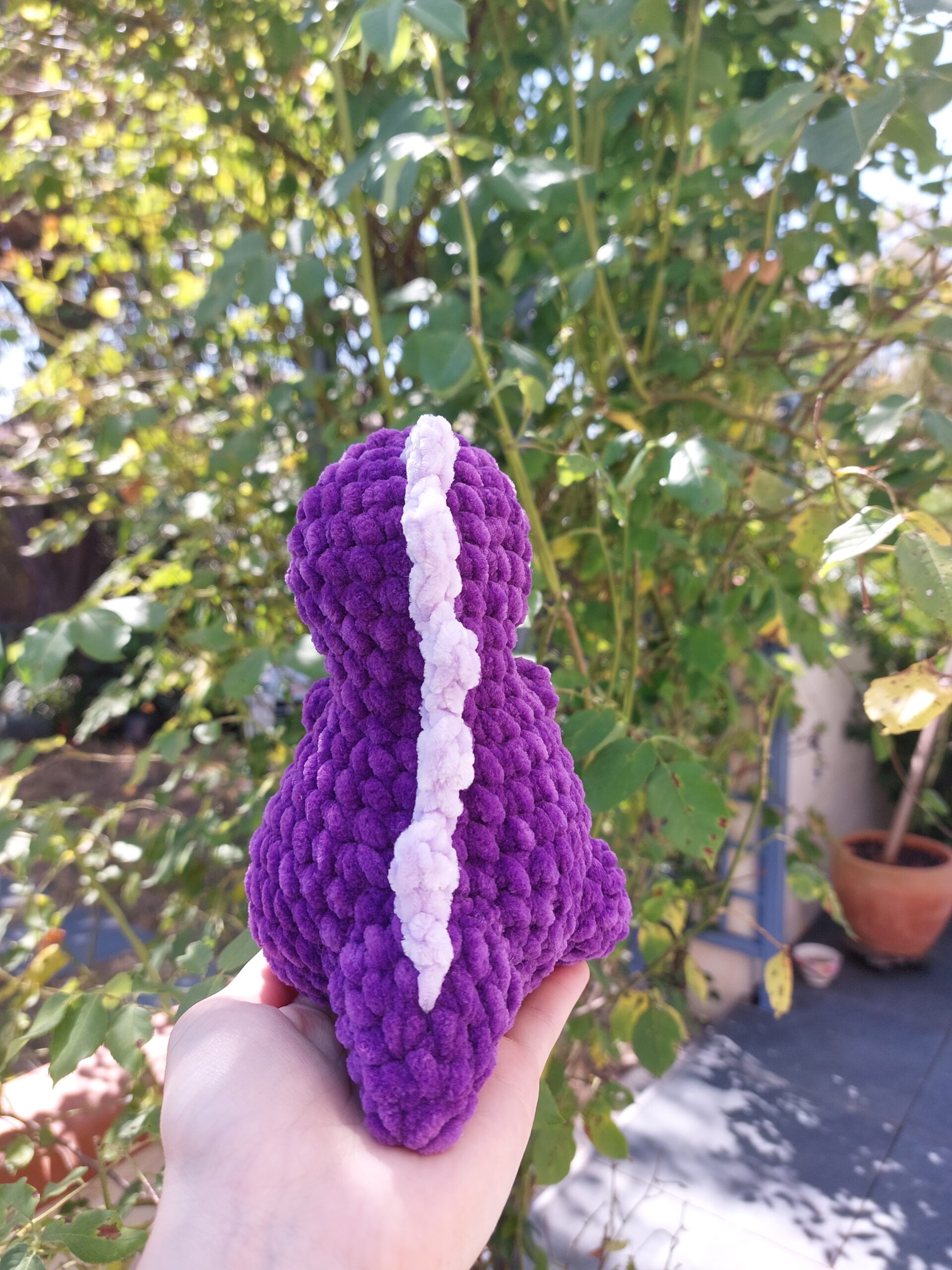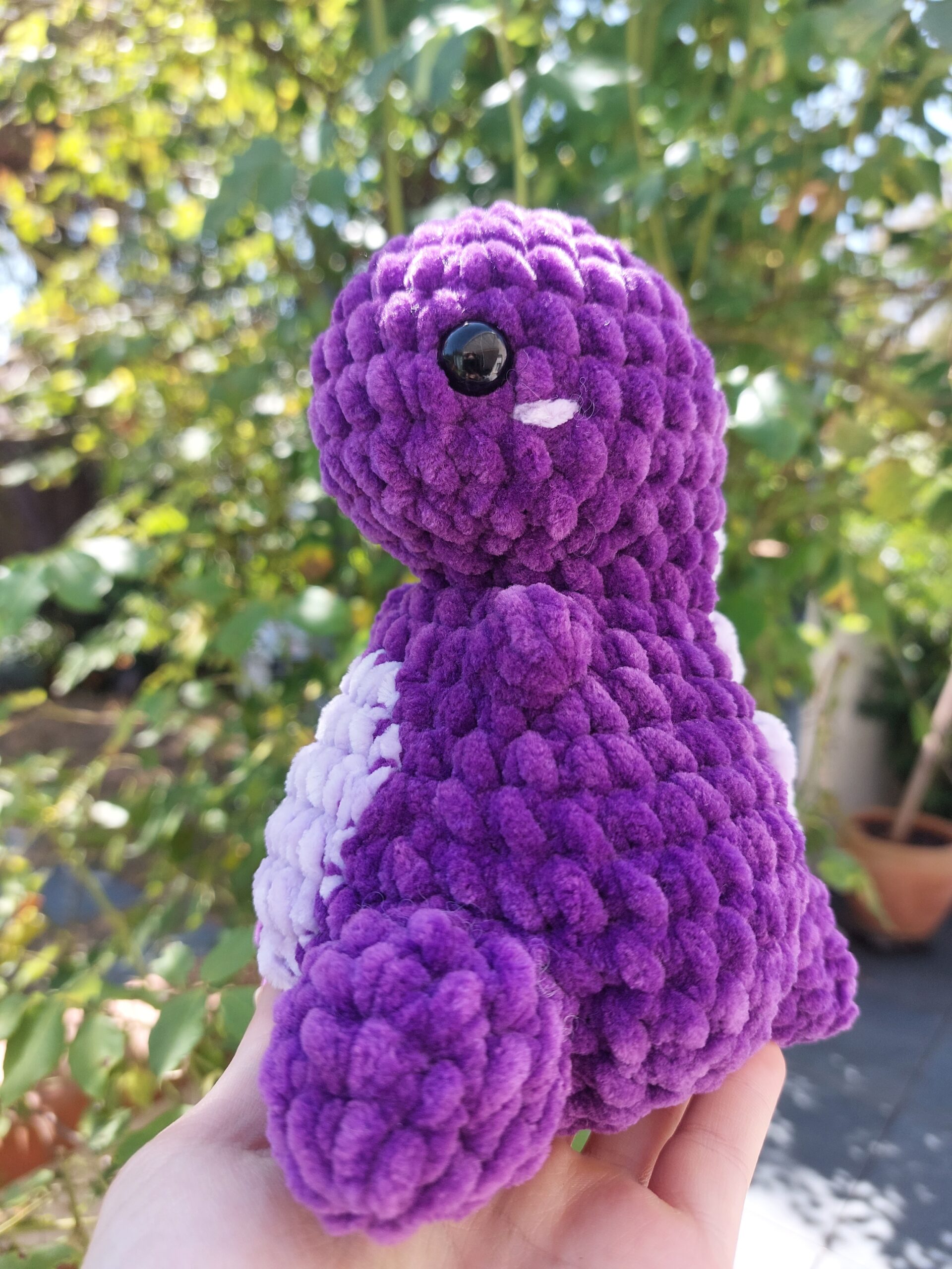 Mini dinosaure fait main avec de la laine ultra douce (violet et lavande). Yeux de sécurité et des détails (joues et piques dans le dos). le ventre est couleur lavande. Idéal pour cadeau