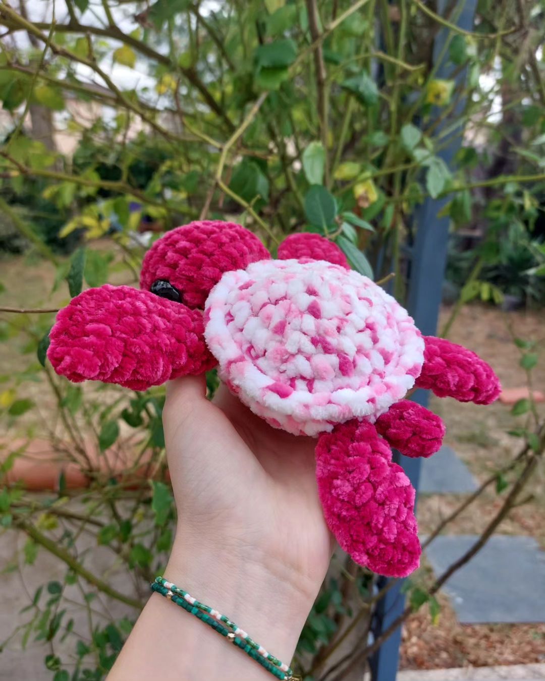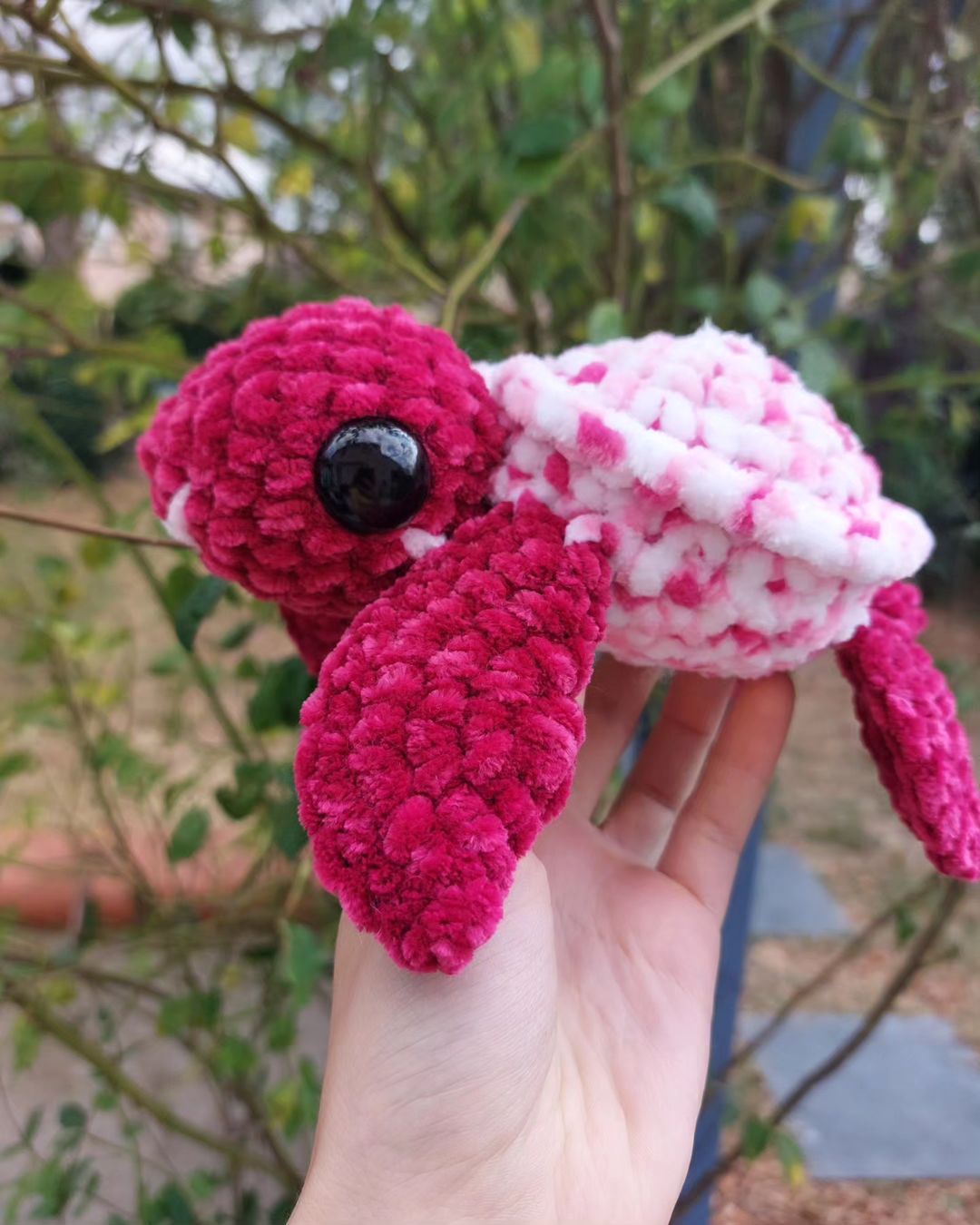 Mini tortue rose et blanche avec des yeux de sécurité, des détails sur les joues.