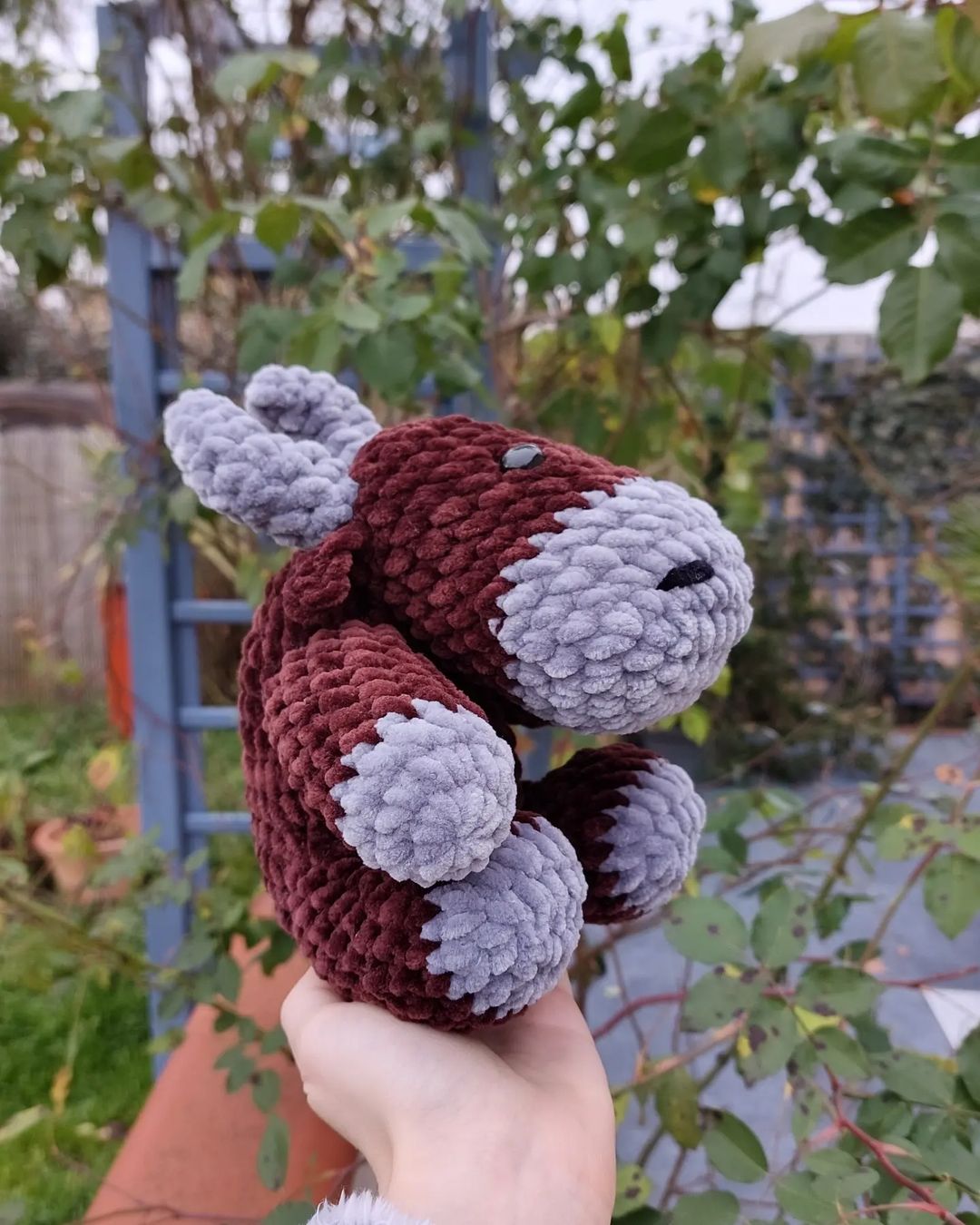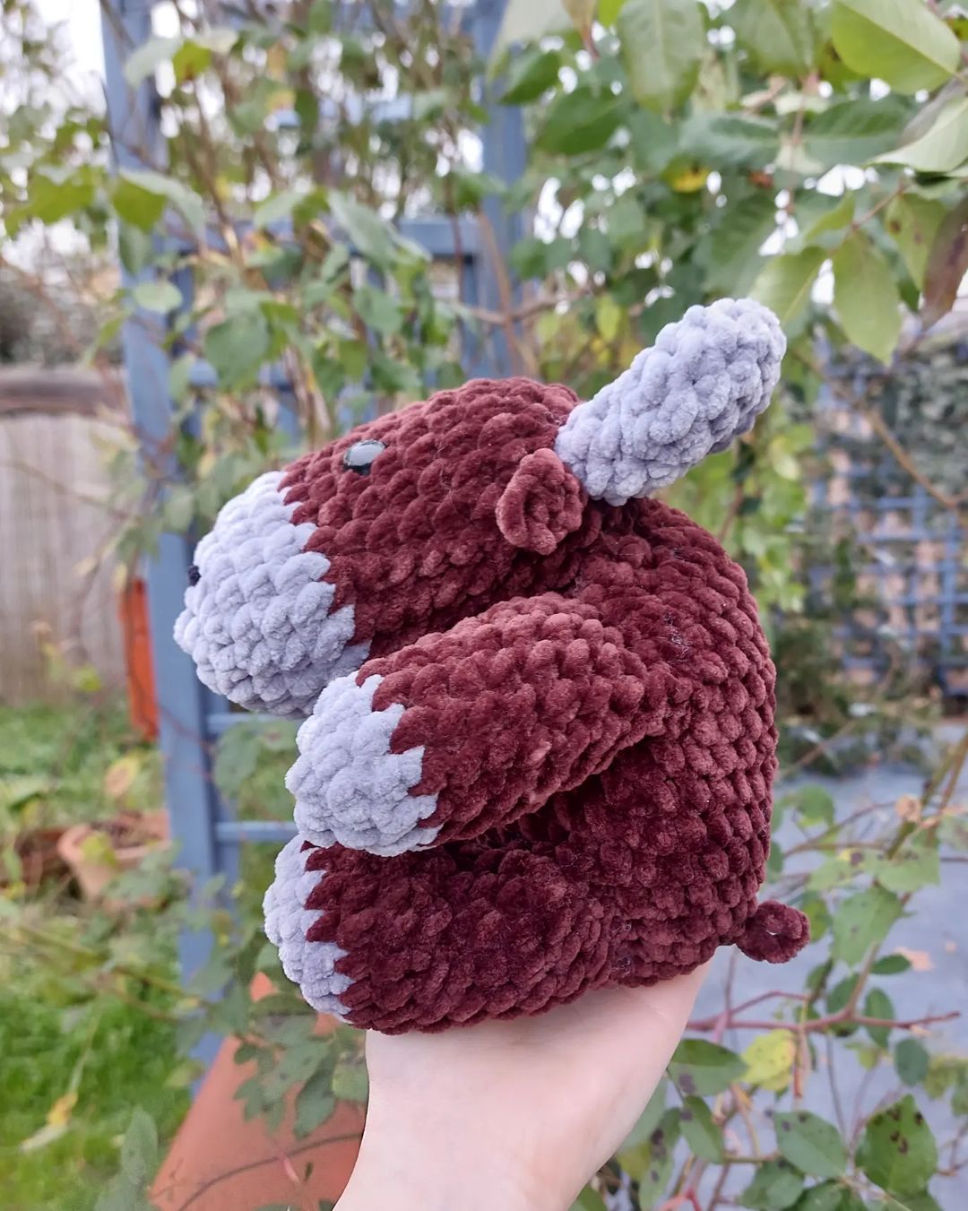 Taureau 🐂 fait main au crochet, laine ultra douce grise et marron foncée. Yeux de sécurité.